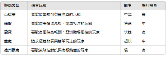 選擇真人遊戲時,玩家應根據自己的風格與資金來決定最適合的遊戲類型: